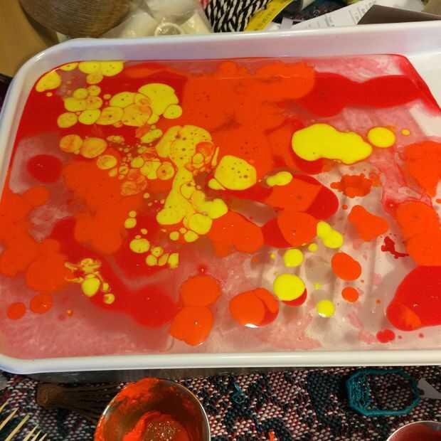 Tengo 6 hojas de papel marmolizado de la bandeja de fotos de pintura arriba.