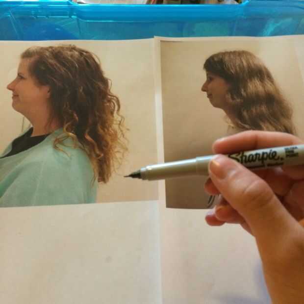 Si una cabeza es más pequeña que la otra cabeza y desea que sean del mismo tamaño, utilizar lápiz para dibujar el contorno de la cabeza más pequeña. Asegúrese de seguir el contorno de la cabeza. Mina de poco menos de un medio centímetro de cabeza. Mi cabeza hermanas parecía todavía un poco más pequeña que la mía pero no ayudar a que mi cabello era super hinchado el día que recibí mi foto para este proyecto!