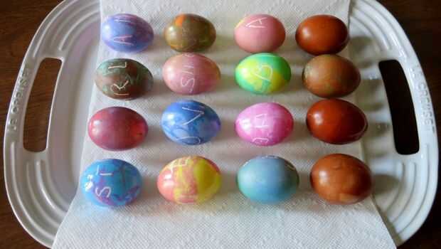 Solíamos comprar los kits marbleizing, pero aprendí este método de Martha Stewart Living, edición de marzo de 2005, utilizando elementos ya en mi despensa. Creo que el colorante neón usé trabajó muy bien con las bases de pastel de los huevos teñidos, pero puede utilizar cualquier colorante te gusta.