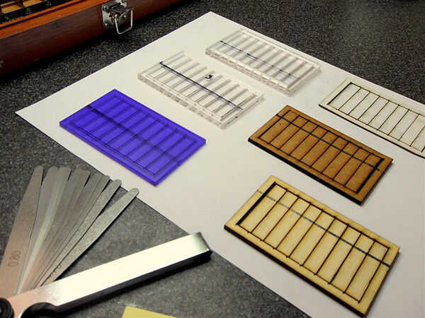 James Williamson ha escrito un gran post sobre cómo calcular el ancho exacto de un corte de láser. Su método muestra que cortar 10 tiras de chapa de al lado le permite amontonan todos los cortes y tomar una lectura mucho más grande, más fácil, de la cantidad de material perdido. Calculé que el corte para esta instalación de azulejo fue aproximadamente de 0,1 mm y he utilizado esta figura al diseño de las tejas y chapas.
