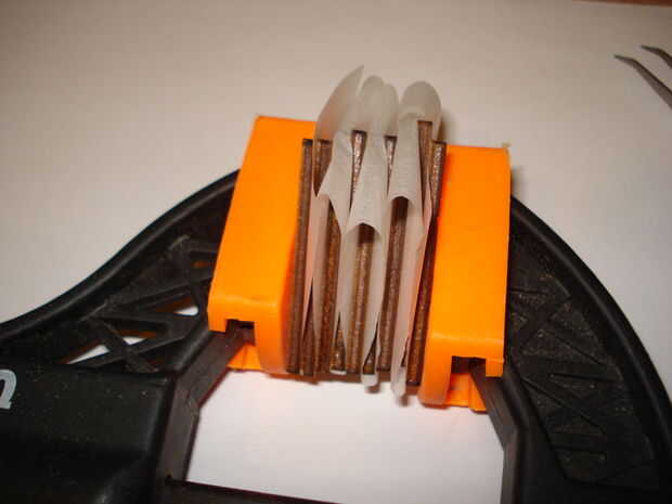 Usé pegamento de madera estándar y un palillo. Llenar el bolsillo con una pequeña capa de pegamento y luego usar el palillo para untar uniformemente por toda la superficie. Coloque la chapa muy bien sobre el bolsillo y presiona los dos juntos. Limpie el exceso de cola que sale por debajo de la chapa y todo lo de la abrazadera hacia abajo. Esto es importante ya que puede deformar la chapa y levante del bolsillo así que mantener el punto bajo presión hasta que el pegamento se haya secado. Envuelve también el azulejo en papel siliconado para dejar la pila de fichas pegadas.