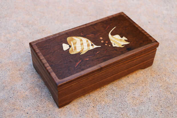 Para crear el diseño de embutido en esta caja de madera (8 x 4 pulgadas), usar Adobe Illustrator para dibujar el diseño vectorial y utilizar el software ImagePaint, que es un plug-in para Adobe Illustrator, para aplicar las imágenes de madera que he escaneado en el ordenador. Con este método, he podido ver todo el diseño totalmente aplicado con imágenes de madera y coloque las formas vectoriales sobre ubicaciones deseadas en la imagen de madera antes de instruir a ImagePaint software para crear las trayectorias de herramienta y enviarlos a mi laser de Epilog para cortar las chapas de madera.