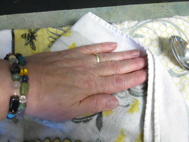 a continuación, utilice una toalla de plato para eliminar más agua. Pulse un lugar seco de la toalla en el molde. Esto obliga al papel en todos los rincones y grietas del molde. Mover la toalla y mantenga presionado hasta que la toalla no puede recoger más cantidad de agua de papel.