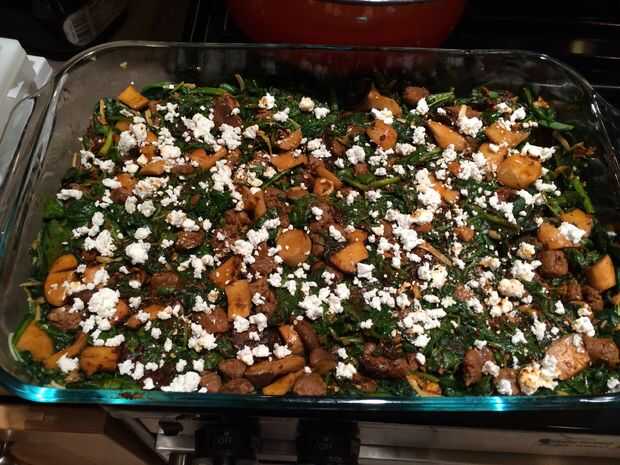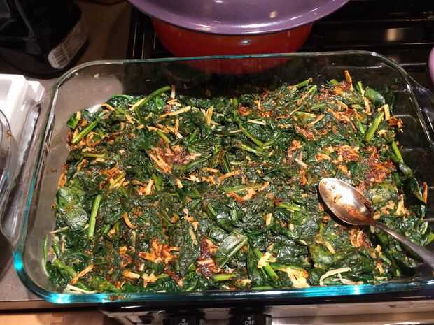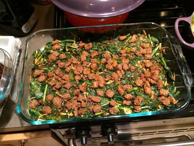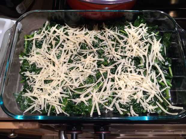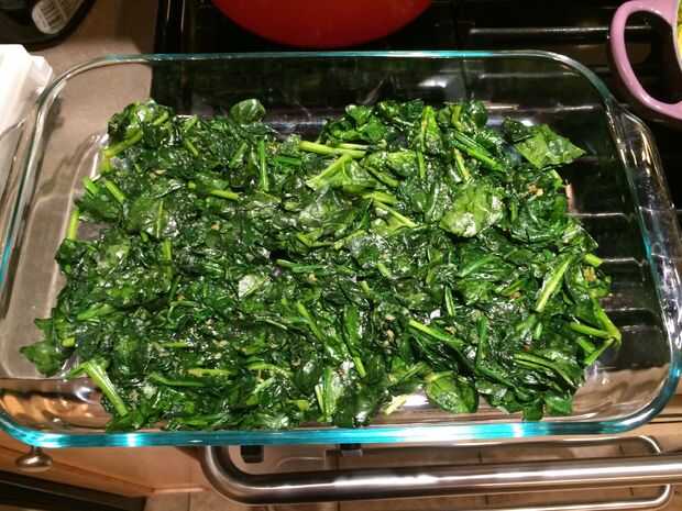 Comience extendiendo alrededor de la mitad o 2/3 de las espinacas a la cazuela. Asegúrese de que la cosa entera uniformemente cubierto, aunque la capa no tiene ser alto.