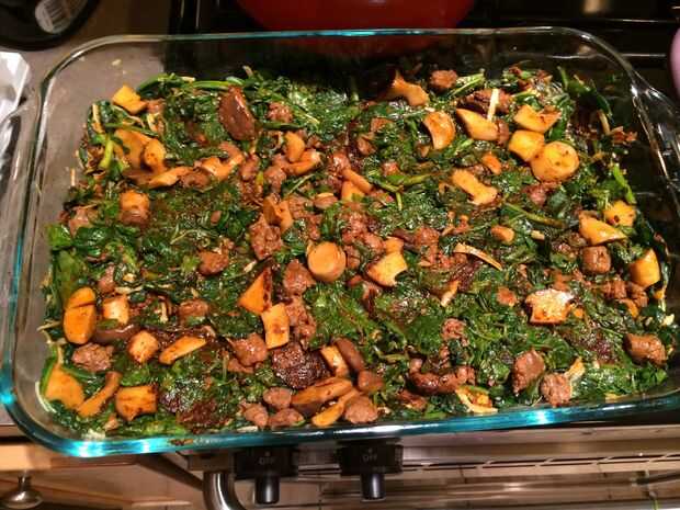 Agregar la salchicha, distribuida uniformemente y añadimos la mezcla de espinacas setas.