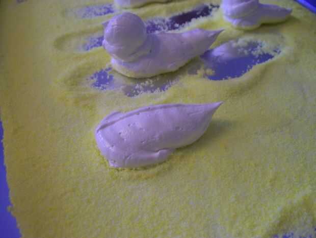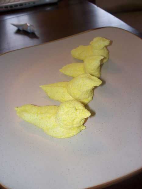 ~ Empezar sus polluelos sobre la hoja de azúcar y galleta de tuberías. Mantenga la bolsa perpendicular al azúcar y aprieta. (Desde la parte superior, o la mano se cubrirán en malva.) Hacer una cucharada ronda alrededor de una pulgada a través y tire la bolsa hacia atrás hacia usted. Libere la presión, darle un poco y tire hacia arriba. No te preocupes de no conseguir una forma "perfecta" de Peep. Píos son hechos por una máquina.