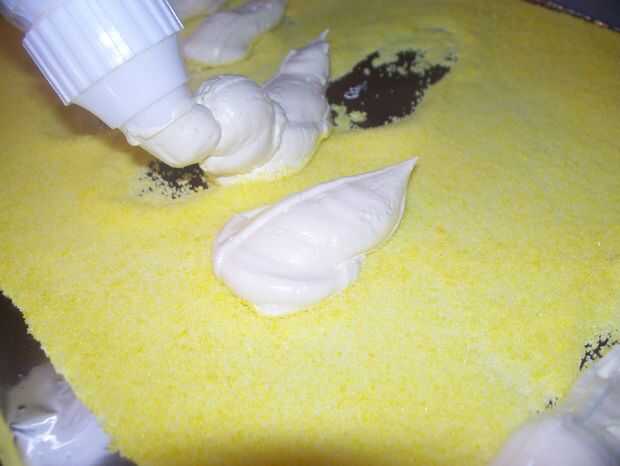 Nota: no soy un chef de pastelería que puede tubo una torta en menos de 5 minutos. Aprender un truco aseado, al hacer esto. Después se espolvorea el azúcar, con cuidado puede esculpir los pollitos a una forma más deseable.