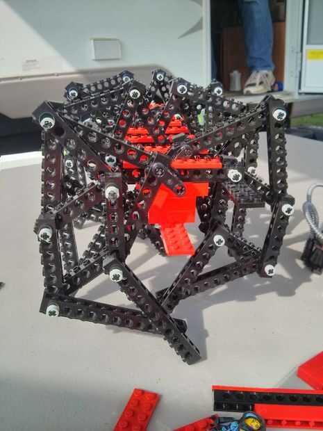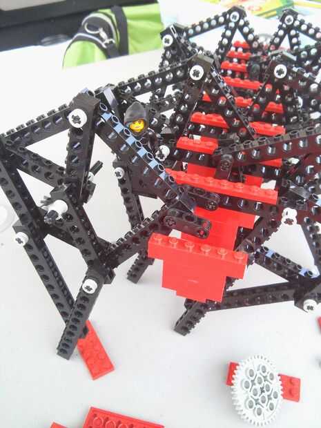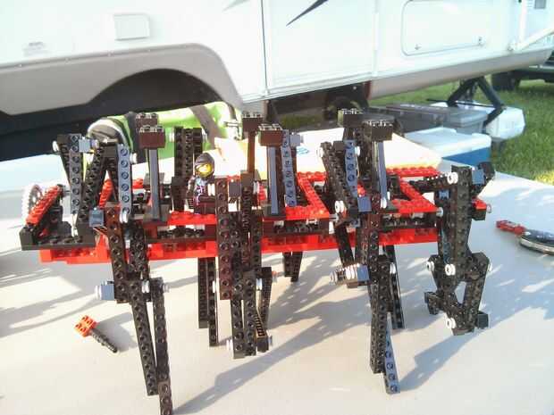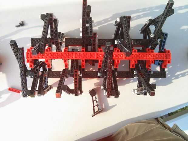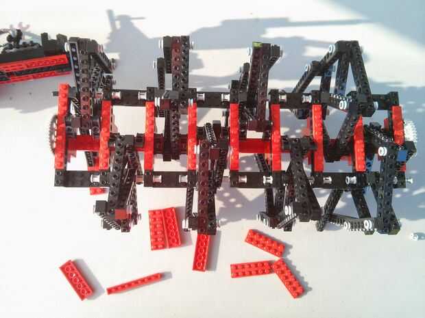 Como se indica en el paso anterior las piernas se unen a la oruga en un patrón de zig-zag alrededor de un cigüeñal. Creo que son 90 grados fuera de fase. Debido a la naturaleza de este mecanismo, es importante que la estructura tenga tanta rigidez como sea posible. La rigidez es esencial para garantizar el buen funcionamiento de las piernas del crawler. Para ayudar con esto he añadido una línea de placas a lo largo de la parte inferior de las piernas del crawler. La superestructura también ayudará a hacer más robusta la plataforma del partido. Más en eso más adelante.