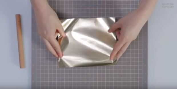 Paso 6: Colocar hoja de hoja sobre el diseño, el lado brillante hacia arriba. Presione hacia abajo con los dedos