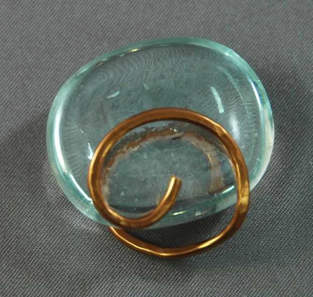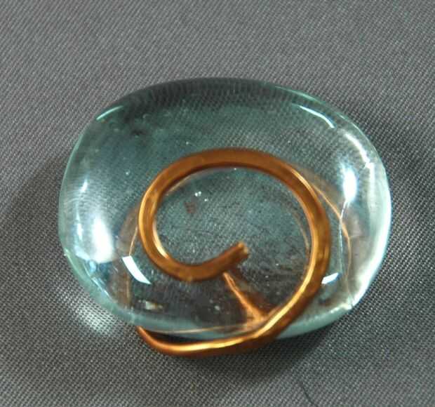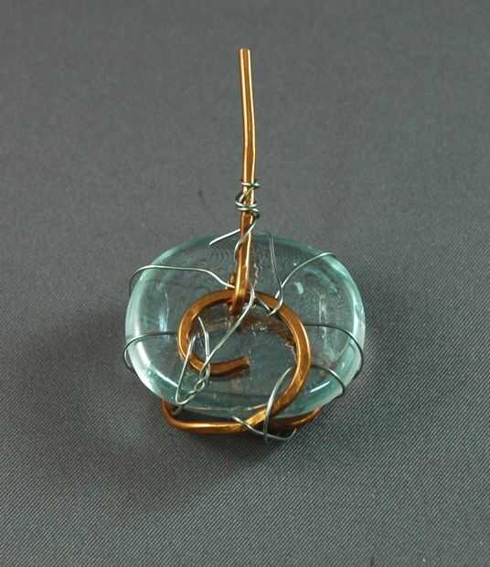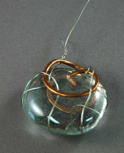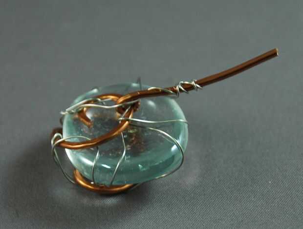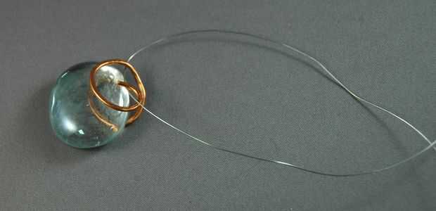 Corte aproximadamente 12" de alambre fino. Ejecutar bajo el alambre de cobre para que la mitad es de cada lado. Comenzar a envolver alrededor de la piedra tipo de como atar un zapato, a partir del interior y el funcionamiento hacia fuera. La piedra debe ser firmemente pero no excesivamente, envuelto cuando haya terminado.