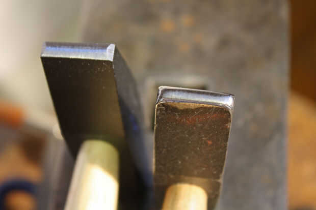 Martillo Cross: La característica más importante de este martillo es la forma en el extremo estrecho. Debe ser una forma de cuña redondeada sin cualquier borde filoso. Mi martillo preferido para la formación de pliegue es un martillo de "Cerrajero" de 300 gramos de Peddinghaus. Es posible que una persona útil hacerlo modificando un martillo existente con una esmeriladora y lijadora. Un nuevo martillo de cerrajero todavía necesitará ser preparado por a lijar los bordes y esquinas. Este proceso se conoce como «vestido» el martillo.