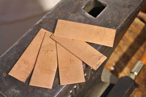 Hoja de cobre fina: calibre 24 (0.5 mm o. 020") espesor en piezas de 1" x 3" o 4". Estos son los tamaños que son los más susceptibles de lograr buenos resultados con una amplia gama de personas. Doblar formando puede ser practicado en la mayoría de los tipos de chapa en escalas que van desde la joyería al gran escultura.