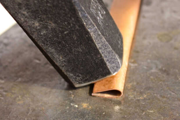 Empezamos por doblar el rectángulo de cobre en mitad del camino largo. Para doble precisión metal por la mitad, utilice la misma técnica que lo haría si fuese un pedazo de papel. Empieza con una suave curva en el centro, alinee los bordes en una lágrima Cruz sección, luego el martillo hacia atrás de los bordes, arrugando el metal.