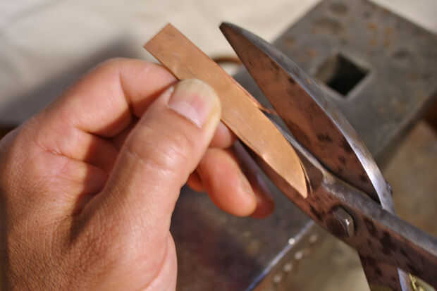 Desde hojas puntos, recorte el metal doblado. Si hay salientes porque el cobre no se dobla por la mitad, esta es una oportunidad para eliminarlos. Idealmente, la línea de corte es una curva suave. Esto requiere algo de práctica para llegar bien. Corte a través de 2 capas de metal al mismo tiempo puede ser un desafío para algunas personas. Un método más simple es cortar una línea recta, luego presentar en la curva más adelante.