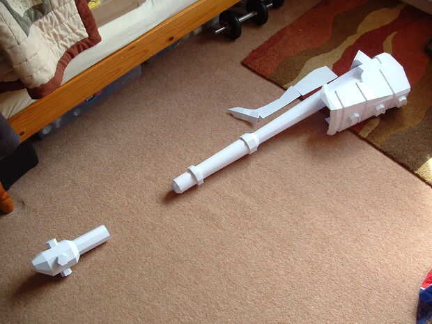 El modelo fue compuesto de cerca de 6 pedazos principales, todos que se cruzan en el modelo virtual, así que tuve que decidir que crearía mis propia cortes/fichas para (todos de la cabeza, algunos bits en el eje y la empuñadura), y que haría exactamente como la red de dictado y corte para caber el modelo principal (a dos cuadras entre la cabeza y la cuchilla). La hoja sí mismo sólo es necesario algunos agujeros de corte para adaptarse a la tubería de acero a través de.
