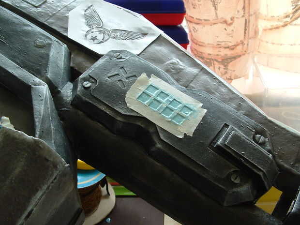 Pintar en azul "luces" en ranuras de la cabeza y en la hoja. Si les enmascare, tenga cuidado de no dejar acumular demasiado densamente antes de quitar la cinta (lo hice, y realmente tuve que marcar los bordes para obtener). Si tienes las pinturas de aerosol disponibles para estas tareas, se verá mucho más profesional, pero que sólo tenía a mano acrílicos.