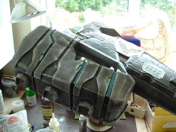 Por último, el importante plata pincel seco para dar la idea de desgaste y arañazos. Trate de ponerlo sólo en los bordes que sobresalen realmente. Los bordes que están realmente protegidos por otros bordes alrededor sólo experimentaría desgaste desde el usuario y no desde el medio ambiente (eg., haber caído). Para proteger a todas las capas de pintura, utiliza una clara capa de aerosol de laca y enarenó ligeramente las áreas la debían para ser mate (todo menos la hoja).