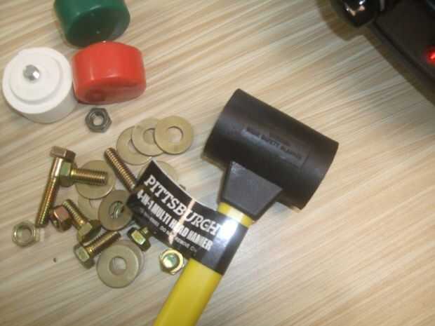 Encontrar un perno o tornillo que coincida con las roscas en el martillo. Este martillo de Pittsburgh usa hilos de 5/16". Hemos añadido las arandelas planas, demasiado, tan sólo para mantener las cosas limpias.