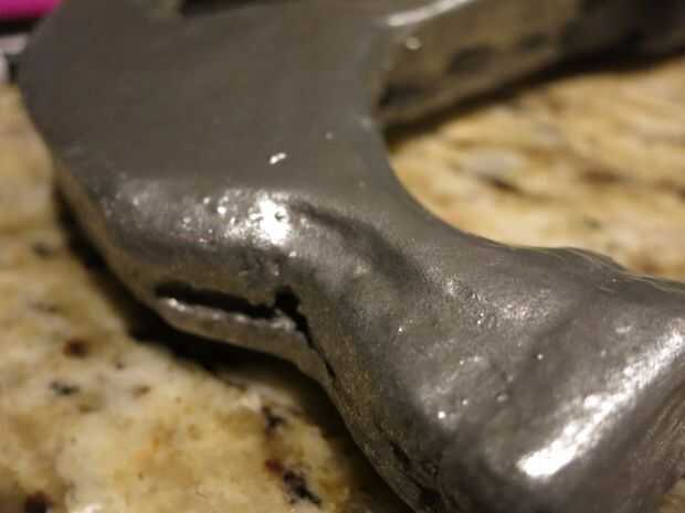 Dremeling la espumaComenzar a Dremel su martillo, usted querrá utilizar el accesorio para lijar con un grano más de arena y luego pasar a un grano más fino. Hacer esto hasta que ve bien a usted. Como cada estilo del martillo es diferente es difícil dar instrucciones específicas sobre esta parte, solo globo ocularlo. Una cosa a destacar es las porciones de la inserción natural de martillos. En la foto de arriba se puede ver en lugar de ir directamente al final del martillo hay tres porciones, dos recuadro formando prácticamente un triángulo, agregando estos hará que se vea mucho más realista y más tridimensional al final.