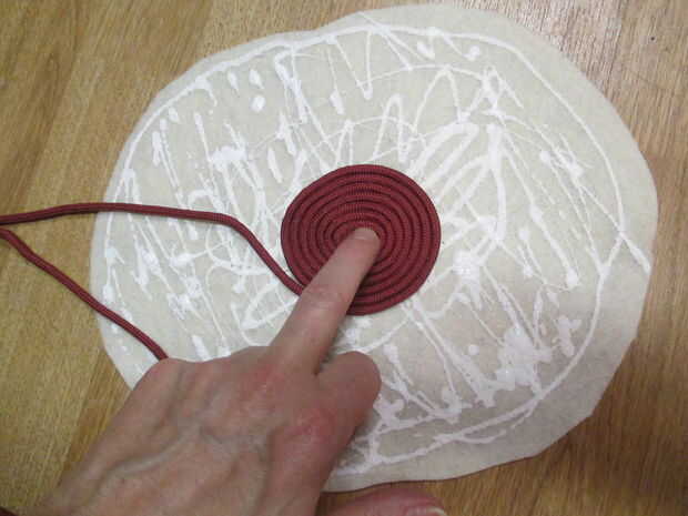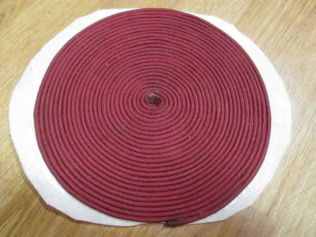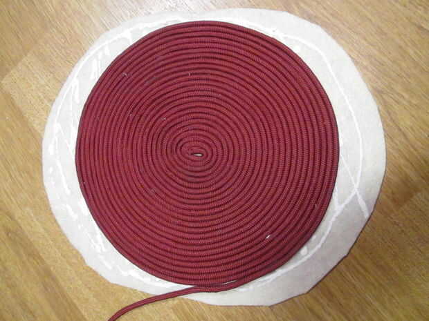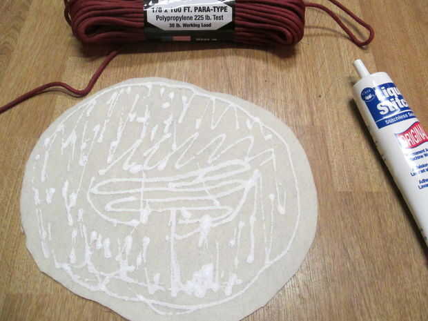 La alfombra se supone que se asemejan a una alfombra trenzada. Corte un círculo grande de oblong-ish de fieltro, había cubierto un montón de pegamento en el y lentamente comenzó a espiral y pise el cable. Terminé usando un poco de paracord. Tal vez varios metros. Había puesto algunos libros en la parte superior y dejar secar durante unos 45 minutos, corte el extremo, aplicar check fray para pegue en el lugar, y luego corte el fieltro por lo que no era visible. Podía haber utilizado marrón o marrón... Tuve blanco. :) Me obligó a ser más diligente sobre el espacio.