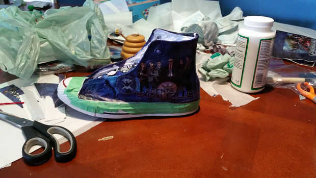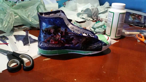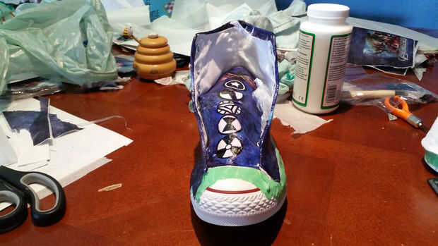 Repita los pasos 4 a 7 para cada lado del zapato. Colocar en varias capas de Mod Podge. Dejar secar totalmente. Siga las instrucciones en la etiqueta de Mod Podge. El exterior Mod Podge recomienda tres días el tiempo de secado. Sin embargo, no necesita esperar esto de largo entre las capas o hacer cada lado del zapato.