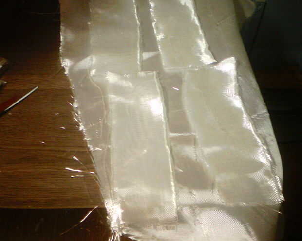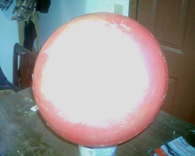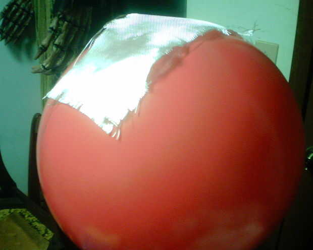 decidí utilizar tela de fibra de vidrio en la cabeza frente a la estera, como me imaginé el paño sería scratchiness menos sucio y menos propensos a causar el estereotipo de piel entró en contacto. Tenía en parte razón. Fue un poco menos sucio, y tenía menos arañazos, pero no por mucho. También esperaba que el paño, una vez resinado en su lugar, haría una curvatura relativamente suave en la superficie de la bola, pero no resultan tan bien como habría sido de esperar. Como yo estaba esperando a la capa de arena y luego colocar otra capa y luego otra capa o tres, me ha decepcionado encontrar muchos lugares donde los bordes de la tela se asomó fuera de la superficie, haciendo una capa muy desigual. (Que es Clyde el Ghoul volando de las manos en el fondo) Es difícil ver en una foto, pero es lo que el fiberglss parecía que cuando llegué a 2/3 el camino alrededor de la bola. Decidí hacer una segunda capa para asegurarse de que la fibra de vidrio sería buena y dura una vez quité la bola de dentro. He dejado un área más o menos la anchura de la cabeza y algunos sin ninguna fibra de vidrio, cerca de 1/5 de la superficie.