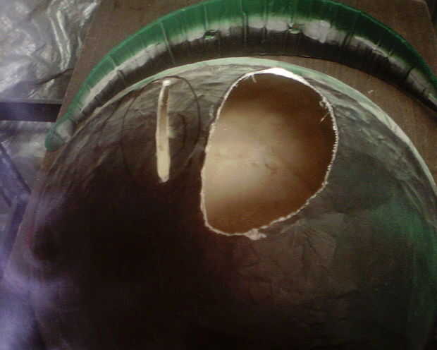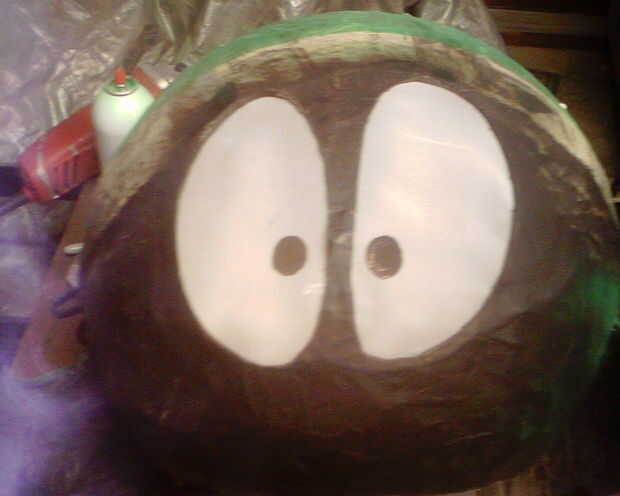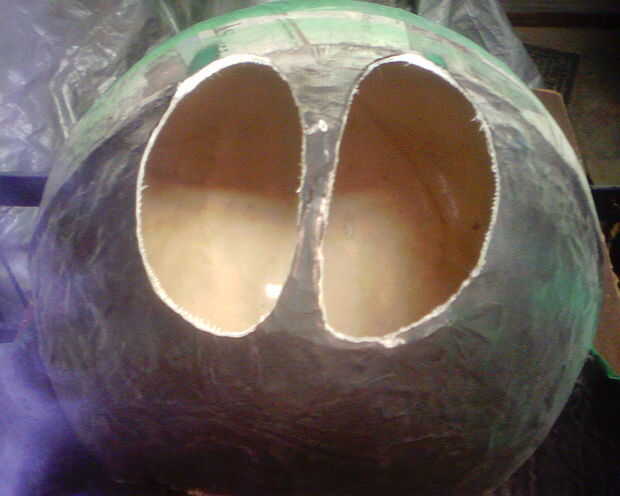 Todo este tiempo, había mantenido va en YouTube y levantando caricaturas Marvin para estudiar las formas de las cosas por lo que puedo trato de hacer las cosas bien, que también tenía el efecto algo agradable de mi disfrutando de las caricaturas todo otra vez! Practiqué su voz, ("allí iba a ser una trascendental kaboom!") estudió su falda y sus zapatos, incluso su caminata. Pero sabía que era de gran importancia para que los ojos bien. Yo había reflexionado sobre si ir tan lejos como para hacer algún tipo de manera viable de cambiar las expresiones de sus ojos y que incluso han trabajado, pero tiempo era de la esencia. No sólo estaba trabajando en mi traje, pero también tenía una exhibición yarda para acabar (ver mi otra Instructable para Halloween), por lo que los animatronics tendría que esperar para otra ocasión. Fui con la mirada amplia, casi inocente, que también tenía la ventaja de permitirme ver mejor por la mascarilla. Así, con rotulador en mano, encontré el centro de la zona de la cara y dibujó dos ojos enormes, ovalados en la superficie. Después de ajustar un poco las formas, tomé mi amoladora de ángulo (mi nueva herramienta favorita) y cortar lentamente en las aberturas hasta que fueron relativamente uniforme y lo más suave que podía manejar una herramienta de gran potencia. Realmente no es un mal oficio en absoluto! Lijar un poco los bordes para librarme de las rebabas y agudeza, tocado para arriba con más pintura negra.