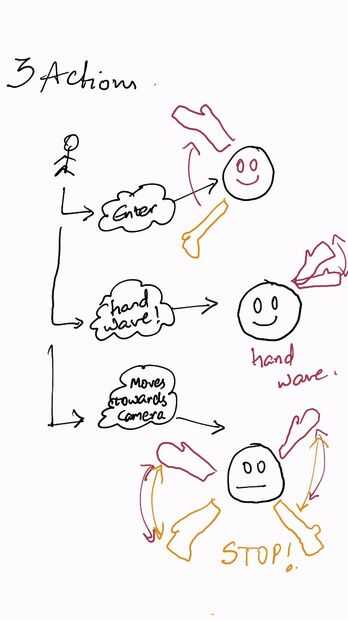 Mediante el seguimiento de las articulaciones de una persona en el campo de visión del Kinect, podemos crear las asignaciones de acciones realizadas por el bot montado en la pared. En el croquis adjuntos, he diseñado varias acciones para el bot. Por ejemplo, agitando en cuanto una persona entra en vista de la Kinect.