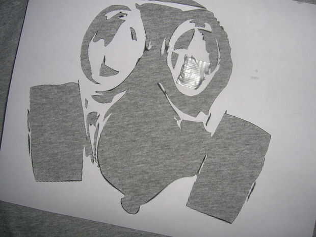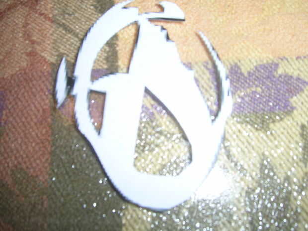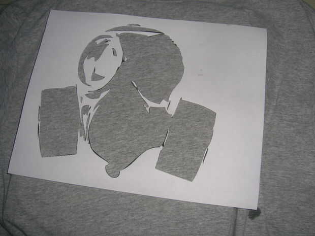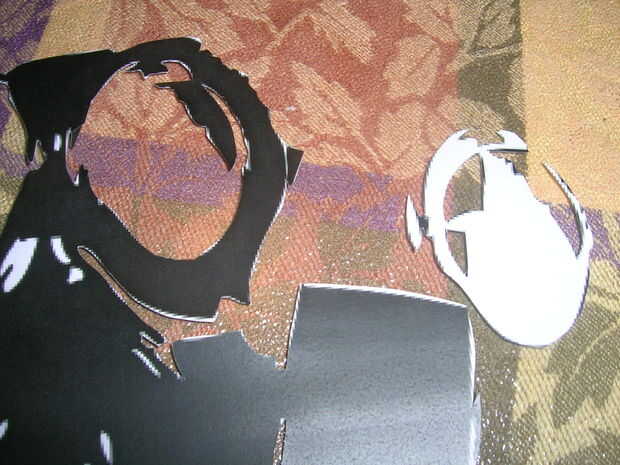 después de seleccionar un diseño de sacar su cuchillo x-acto y cortar las piezas negras. (véase el cuadro) las partes de la isla del diseño... cortar y después recortar una parte en medio de la pieza de la isla es donde usted pondrá un trozo de cinta y la cinta lo sostenga en su lugar en la camiseta. Ahora coloque todas las piezas del diseño en la camisa.
