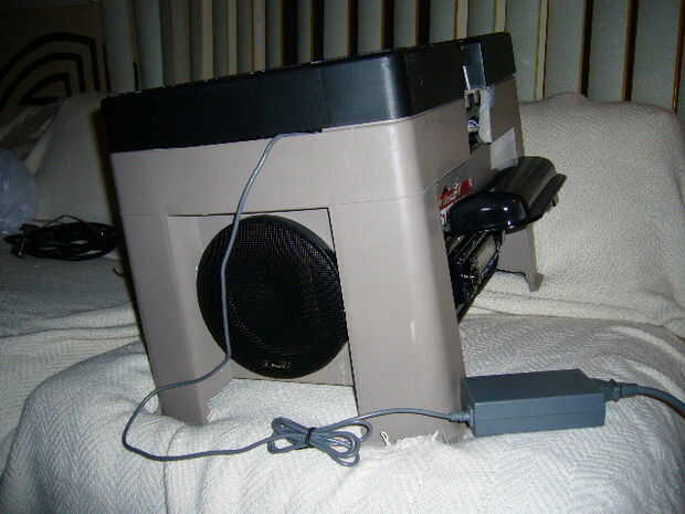 La caja de herramientas es un Contico sobre $40 en Walmart en línea. Esta caja de herramientas es resistente, puede paso y sentarse en él. Cajas de herramientas para alrededor $20 lo, pero limita el tamaño de los altavoces. El orador de lado en esta foto es un woofer de 8' ($15) con una parrilla de 6' sobre él. Orientados hacia atrás son un par de 6' coche altavoces estéreo de Walmart por $35