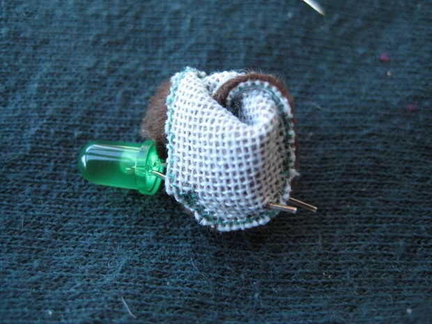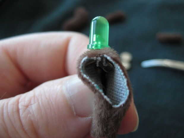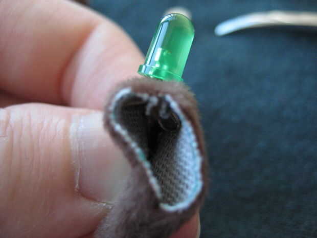El LED se une al cuerpo, empujando a los conductores a través de la tela en el cuello.
