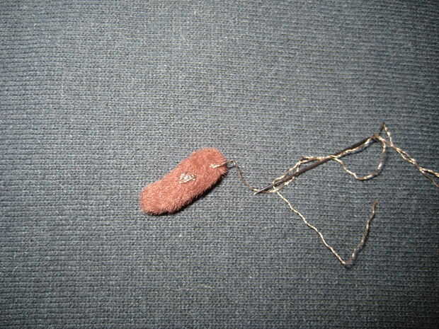 Prueba el circuito en este momento enganchando un hilo de batería a través del cable de LED correcto, engancha la cola de hilo de rosca del brazo al otro cable del LED, y luego colocando el otro hilo de la batería en el parche de puntadas que usted sólo cosido.