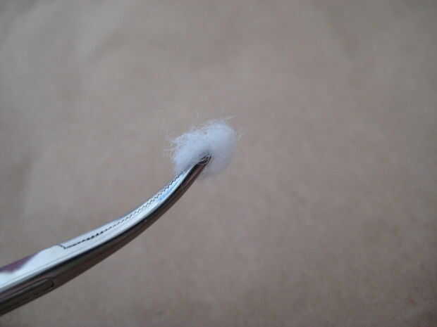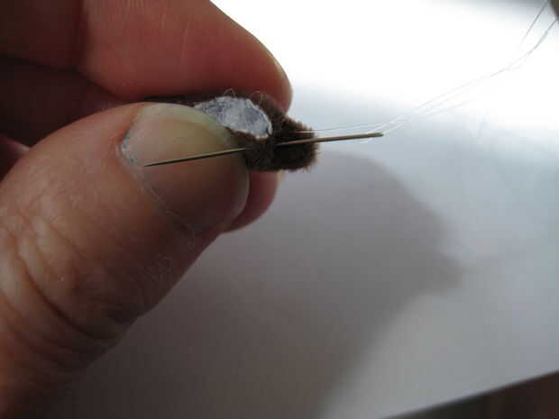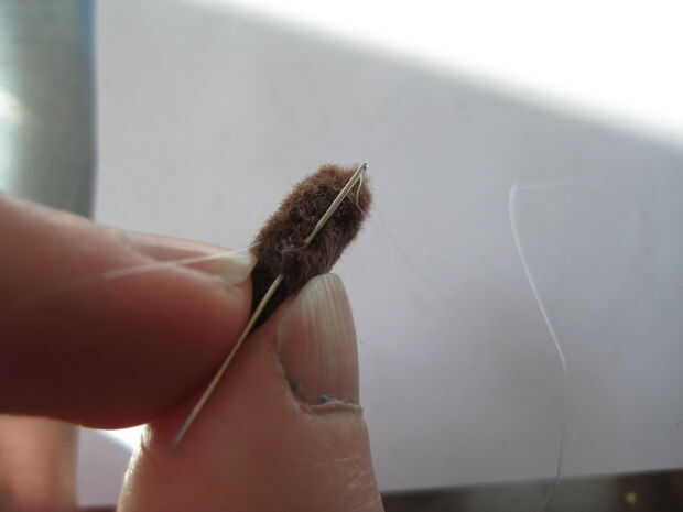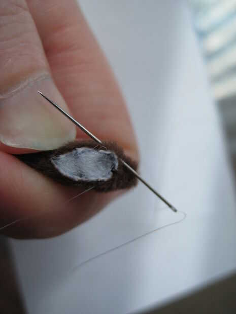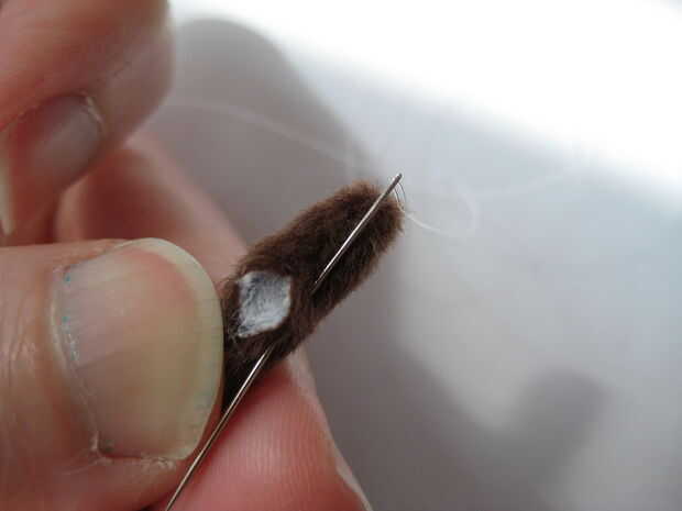 Ahora, toma un poquito de relleno de fibra poliester y rodar en una bola pequeña. Utilice las pinzas hemostáticas para empujar la bola de relleno dentro de la pata. Poner algunos más relleno en el hombro y después empuje alguno en la parte media del brazo. Mantenga la adición de relleno hasta que crees el brazo completo.