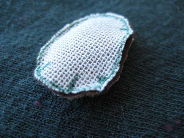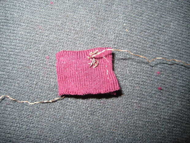 A continuación, sacar las baterías y utilizar el hilo conductor para agregar conexiones de las baterías. Al lado de cada batería que toca a la tela tendrá que conectar el hilo conductor. Utilizar unas puntadas a cada lado para asegurarse de que usted tiene una buena conexión y deja una larga cola de hilo de cada lado del soporte de la batería. NO coser a través de ambas piezas de tela con el hilo conductor.