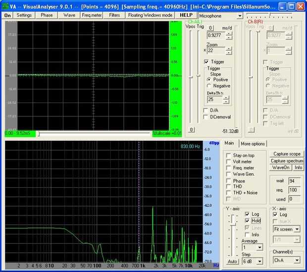 Usted notará las cumbres aparecen y desaparecen muy rápidamente. Estoy usando un vaso de precipitados por el extremo de la goma de borrar de un lápiz. Si desea capturar los picos, simplemente haga clic en la casilla de verificación "Guardar". La ventana FFT entonces retendrá todos los picos. Una vez que te has dirigido a conseguir algunos buenos picos necesitará desactivar el alcance. Si no vas hacer algo de ruido y sus picos será ido (confía en mí en esto).
