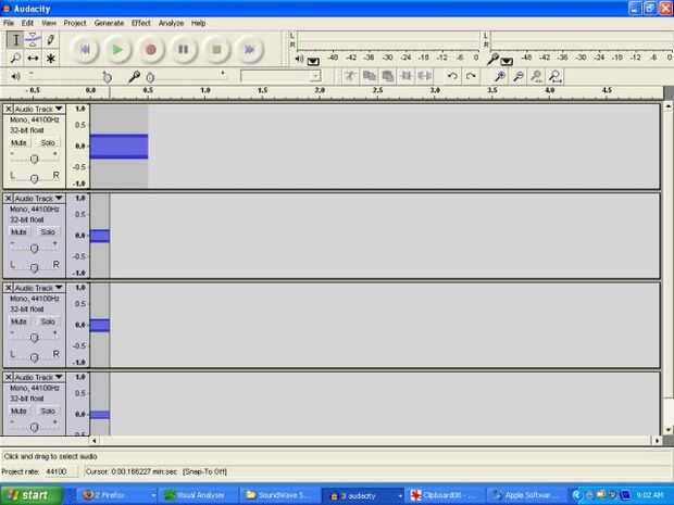 Así que, vamos a volver a Audacity y recortar nuestros sonidos. Simplemente haga clic y arrastre sobre la región que no desea y luego presione la tecla Supr. Voy a dejar que la primera frecuencia duran alrededor de medio segundo y recortar a los demás a cerca de un cuarto de segundo.