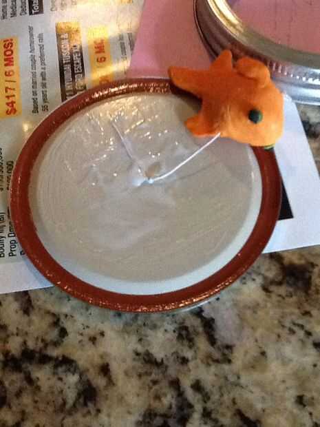 Ajuste de tiempo para probar! Baje el pescado en el recipiente hasta que quede a una altura óptima. Haga una marca o un nudo en la cuerda en el punto donde la cadena tiene que ser colgado. La cadena en la tapa de la cinta, luego aplicar Mod Podge para la cinta adhesiva. Es definitivamente mejor no dejar cabos sueltos, así que corte la cadena sobrante para que la cinta podría cubrir completamente. Grabar todo el camino alrededor de donde cuelga la cuerda ayuda a prevenir la cinta de estiramiento! El cuadro sólo muestra la cadena con cinta hacia abajo sin refuerzo, y estira un poco.