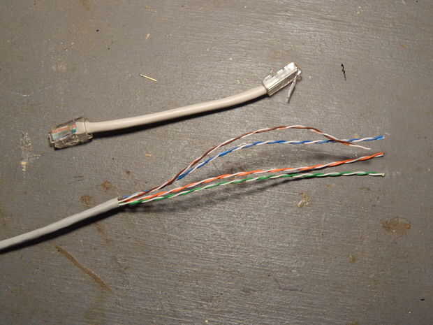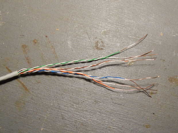 Se trata de uno de los más omnipresentes cables, despojado en filamentos individuales puede ser muy útil en el abordaje de pan. Pero ¿y si en cambio quieres algo de corriente más alto como el cable de altavoz? Conductores de cable CAT 5 son un poco pequeños para tanta corriente (alambre de calibre 24-26). ¡ Pero espere! Tiene 8 conductores, si pones 4 de ellas en paralelo en grupos de 2 ahora tiene un cable que es aceptable para las corrientes justas (el indicador está ahora sobre equivalente al calibre AWG 18 a 20). Yo no usaría para voltajes sobre unos 30 voltios porque está aislado para tensiones bajas.