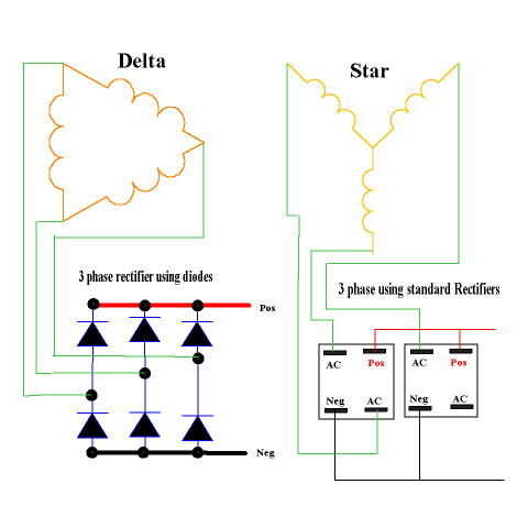 Después de un tiempo me encontré con un sitio que le dio un montón de información sobre circuitos 3 fases. (http://www.windstuffnow.com/main/3_phase_basics)