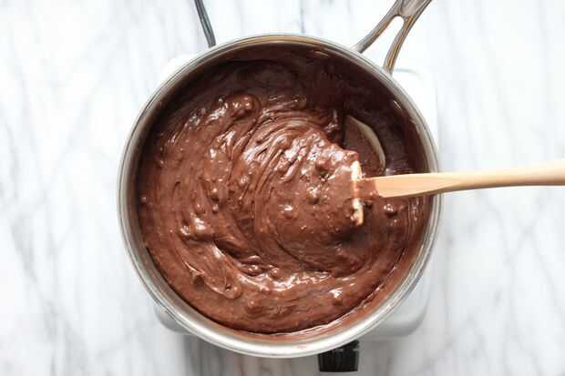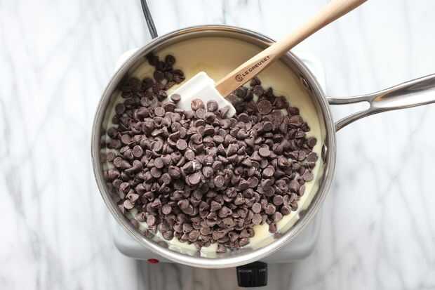 Vierta la leche condensada y agregue tres tazas de chispas de chocolate junto con una pizca de sal. Mezclar esto con frecuencia hasta que todo se funde. Las virutas de chocolate con leche funden casi instantáneamente, pero algo más oscuro tardará un poco más.