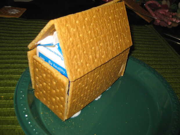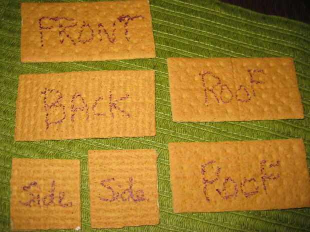 No te preocupes los bordes uniendo... más adelante; se utilizará hielo más para delinear toda la casa. Además de las galletas abajo... también necesita uno más a la forma en dos triángulos de la zona de dos aguas del techo. (Ver la última foto en el grupo a continuación.)