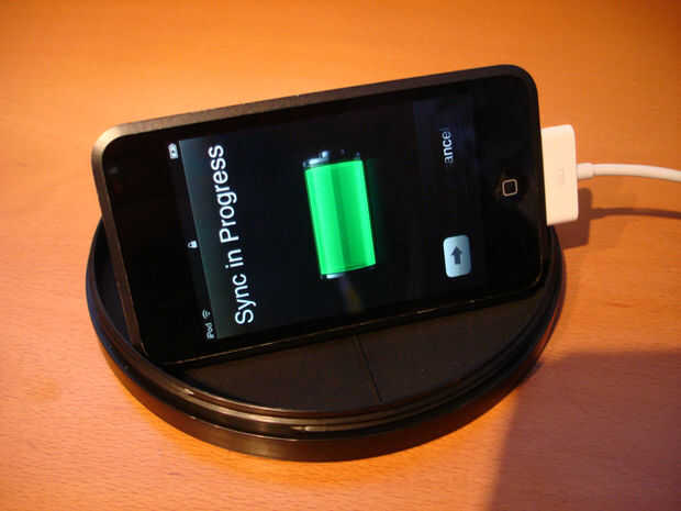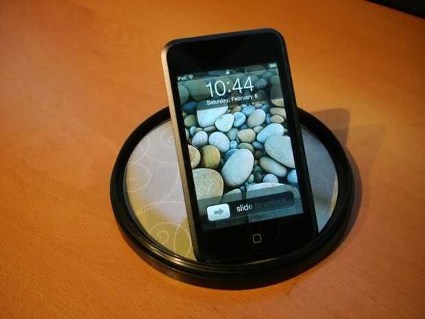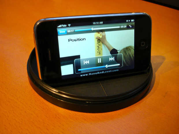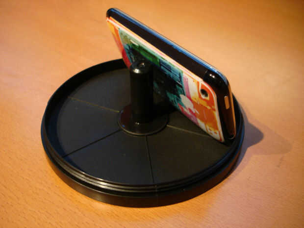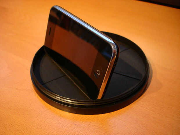 Colocar tu iPhone / iPod Touch en la bandeja del huso y listo! El labio en la parte inferior de la bandeja captura el borde del iPhone sin oscurecer la pantalla en todo. Lo bueno de esta idea es que 1) no hay ningún ajuste es necesario para conseguirlo sentarse directamente en el escritorio 2) hay no "mala" manera de poner el iPhone en el soporte y 3) que funciona en cualquier orientación (por supuesto si usted levantarse verticalmente no se enchufa a la vez)