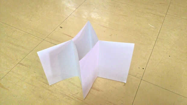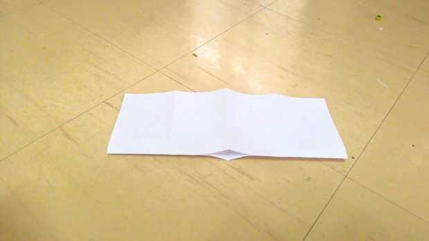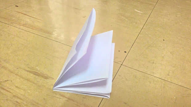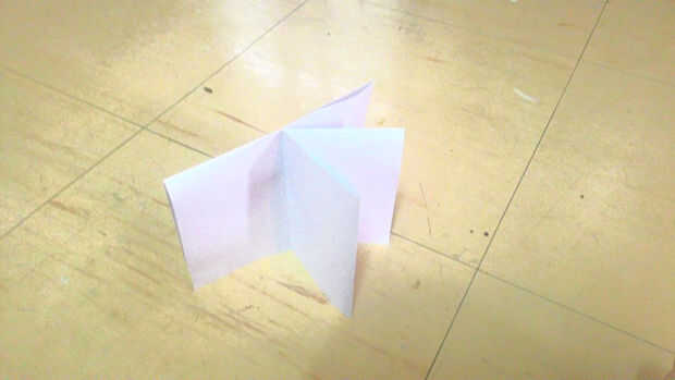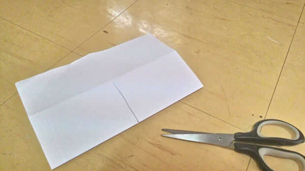 Ahora, corte a lo largo del pliegue central en el borde doblado del papel hasta llegar al pliegue en. Ahora desplegar el papel y doblar por la mitad lateral. Pellizque los extremos y empuje hacia adentro hasta que las aletas medianas palillo hacia fuera. Doble por lo que parece un libro y un pliegue una última vez.