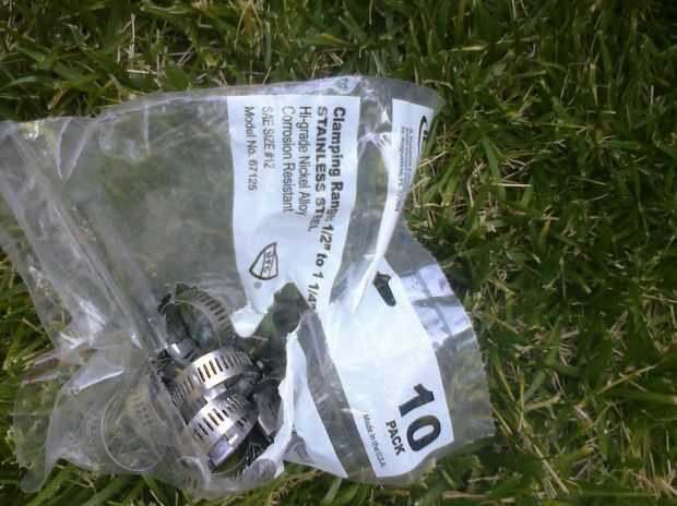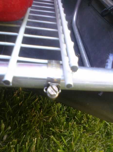 Luego se mide la anchura del remolque entre los rieles, correr a la tienda y comprar uno de esos estantes de alambre que llevan para closet remodelado. Asegúrese de que la longitud es dos veces la anchura del remolque. (Nuestro coste menos de $5,00). También pick-up 8 abrazaderas (una bolsa de ellos cuesta menos de $1,50). Para barato pero menos robusto, puede utilizar abrazaderas de plástico.