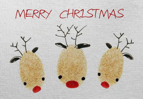 Ofrecer diversión mensaje de vacaciones con esta tarjeta Reno luminoso y alegre. Mojar el pulgar en la pintura marrón y huellas dactilares de sello al frente de la tarjeta. Ahora dibujar las cornamentas de los ojos con marcador marrón rojo y una nariz linda con marcador rojo.