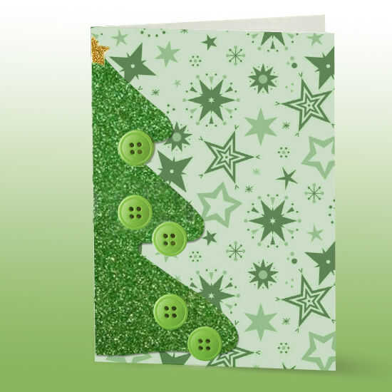 Doblar un trozo de cartulina por la mitad y cortar el papel estampado en forma de árbol de Navidad de la mitad. Adornar el árbol con color coordinado botones adherido con pegamento y para completar el look añadiendo una etiqueta estrella en la parte superior del árbol.