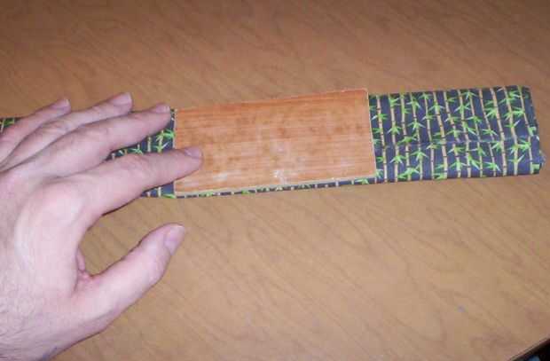 Doble a la tela como se muestra. Utilice la plantilla para conseguir la anchura correcta.