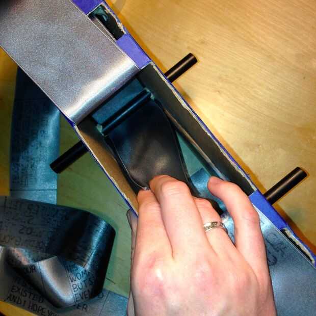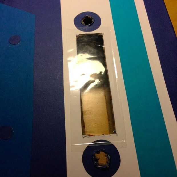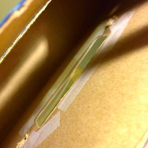 Inserte la paja boba la ha cortado y salga por el orificio correspondiente en el otro lado de la caja; Estos serán nuestros pajas de carrete. Inserte la cinta en la caja a través de la ventana de visualización grande, alimentación alrededor de la paja de apoyo más pequeño instalamos antes, y traer hasta la paja dos carrete acaba de agregar. Asegúrese de que no gire la cinta, y que las letras están mirando hacia afuera.