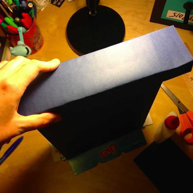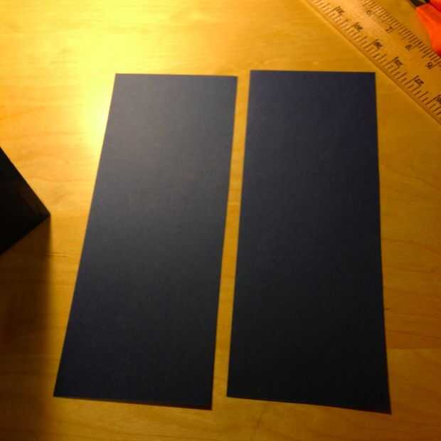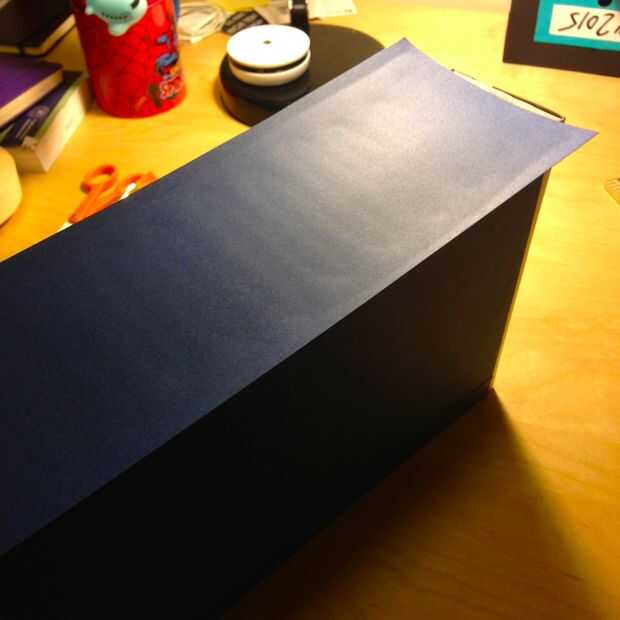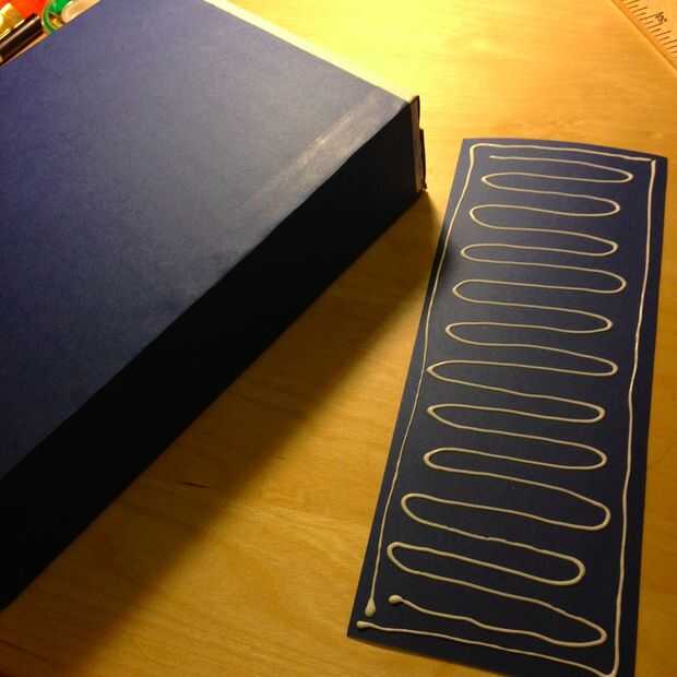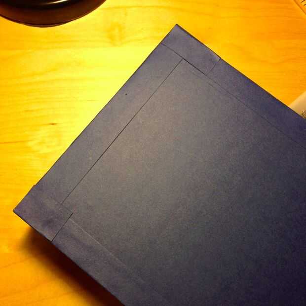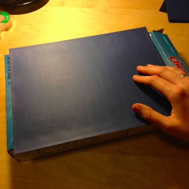 - Cortar 2 hojas de papel por la mitad longitudinalmente. Usar 2 de ellos para cubrir los bordes laterales de la caja, arrugando el papel duro alrededor de los bordes de la caja a medida que avanza.