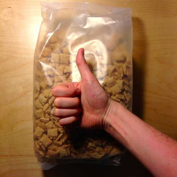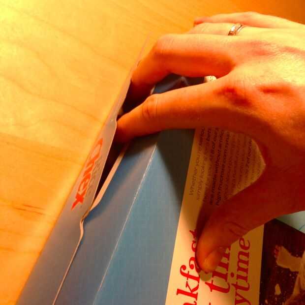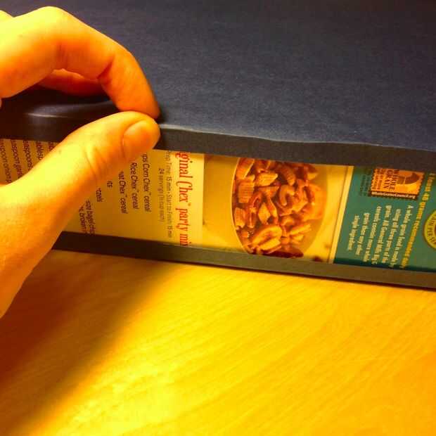 Tan cuidadosamente como sea posible, abra la caja de cereal, teniendo cuidado de no para rasgar las lengüetas en la apertura. Retire la bolsa de cereales, ahorro para desayunos futuros. Vamos a dejar este fin abierta hasta que cortamos nuestra ventana en la parte superior de la caja; Si lo cerramos ahora, será mucho más difícil reducir las ventanas.